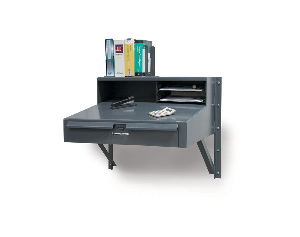 - This Strong Hold shop desk is built to stand up to the toughest working conditions. Made with 12 GA steel, this desk is made to be mounted to the wall, perfect for tight working spaces. The desk is 30 in. W x 28 in. D x 27 in. H with a drawer. The drawer has a weight capacity of 400 lbs and can be secured with a padlock. There is also a riser shelf for additional storage.