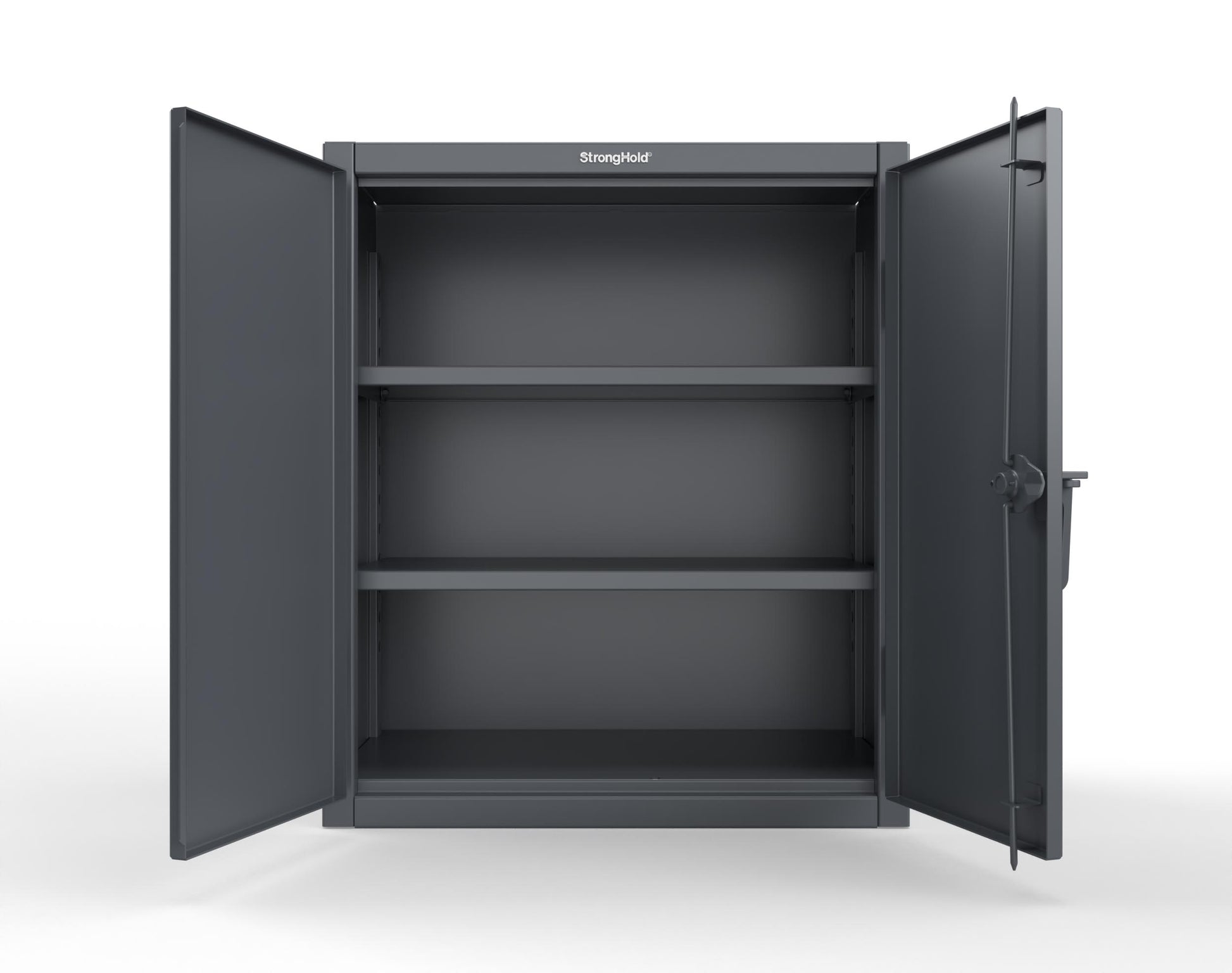 - This Strong Hold cabinet is built to support your toughest industrial storage needs. Made with 12 GA steel, the cabinet stands at 36 in. H x 42 in. W x 20 In. D. Standing at countertop height, you will be able to fit this cabinet into tight spaces easily. The structural strength of our all-welded, wrap around body reduces the number of welds and the need for bolts. This cabinet features 2 adjustable shelves that have a load capacity of 1900 lbs each.