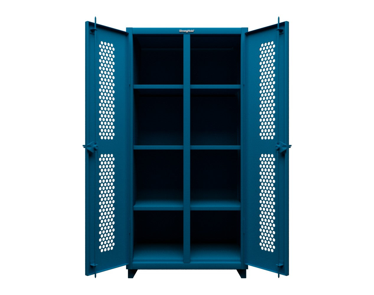 - This Strong Hold double shift ventilated (hex) cabinet is built to support your industrial storage needs. Made with 14 GA steel, the cabinet stands at 75 in. H x 72 in. W x 24 In. D. The structural strength of our all-welded body now can support up to 7,600 lbs. This cabinet features 6 adjustable shelves that have a load capacity of 950 lbs each.