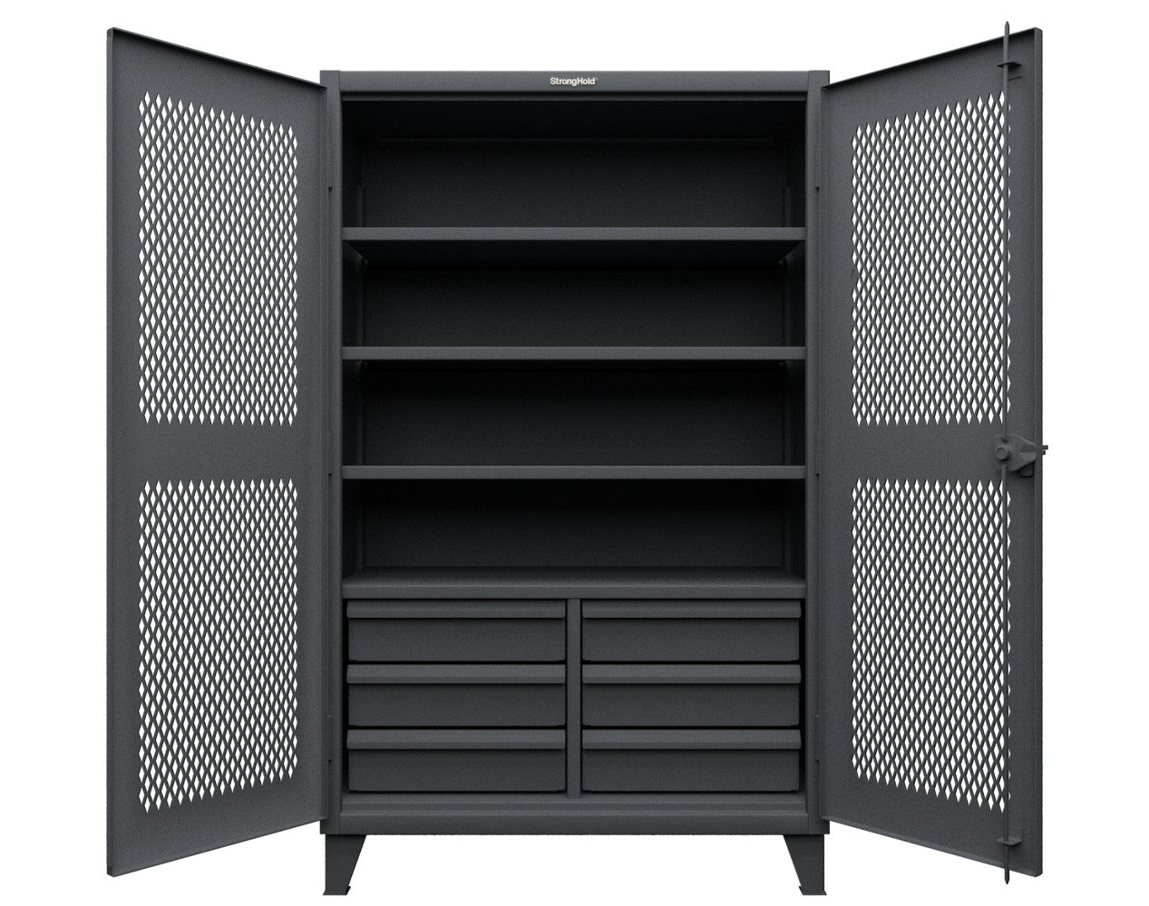 - This Strong Hold ventilated (diamond) cabinet is built to support your toughest industrial storage needs. Made with 12 GA steel, the cabinet stands at 78 in. H x 48 in. W x 24 In. D. The structural strength of our all-welded, wrap around body now can support up to 11,000 lbs. This cabinet features 4 adjustable shelves that have a load capacity of 1500 lbs each. On the lower half of the cabinet, there are 6 half-width drawers that are 6 in. tall and each have 400 lbs load capacities.