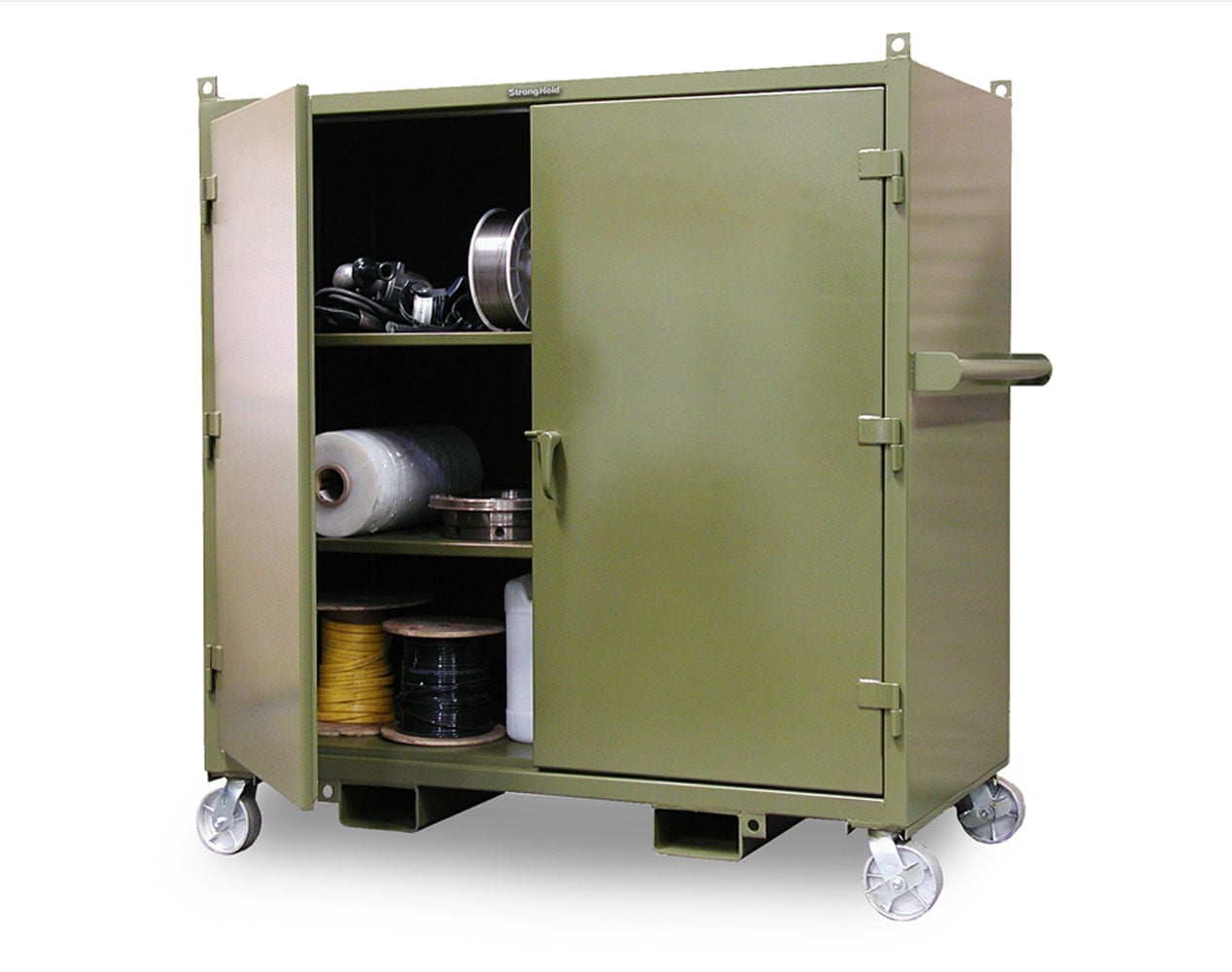 - This Strong Hold mobile jobsite cabinet is built to support your toughest industrial storage needs. Made with 12 GA steel, the cabinet stands at 68 in. H x 66 in. W x 34 In. D. The structural strength of our all-welded, wrap around body reduces the number of welds and the need for bolts. This cabinet features 2 adjustable shelves and has heavy-duty casters with a welded push handle. Allowing for even easier mobility, there are also forklift pockets on the bottom of the cabinet and lifting lugs on the top.