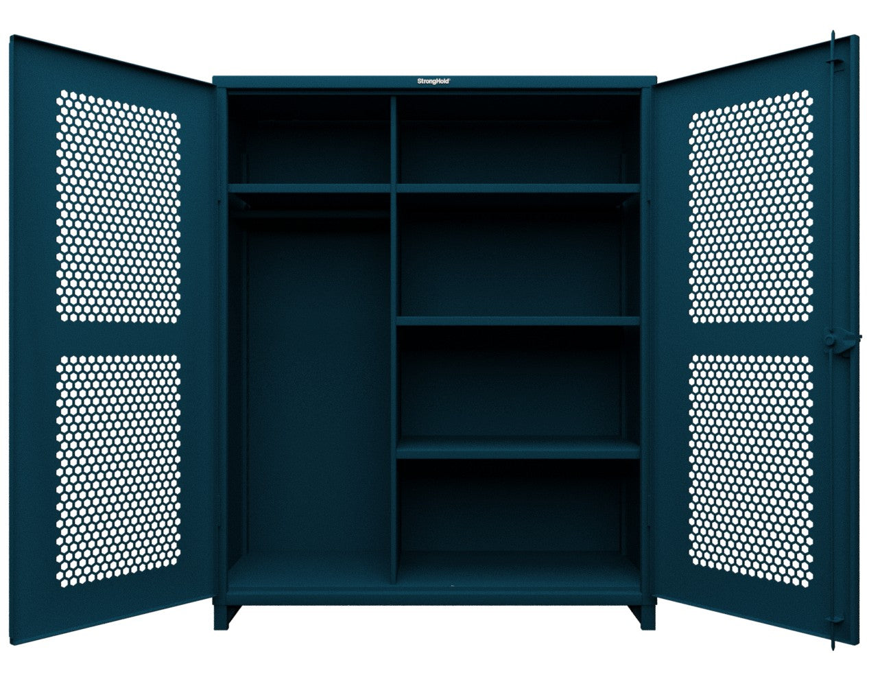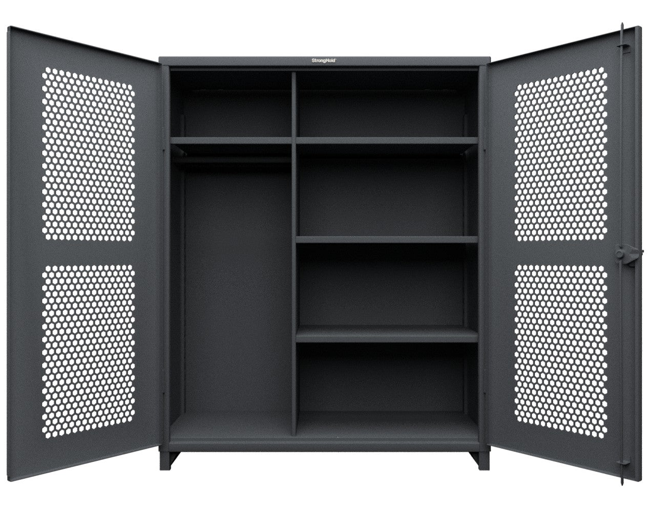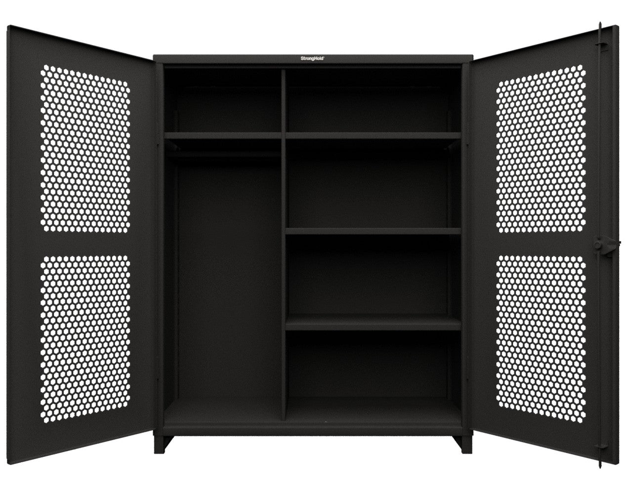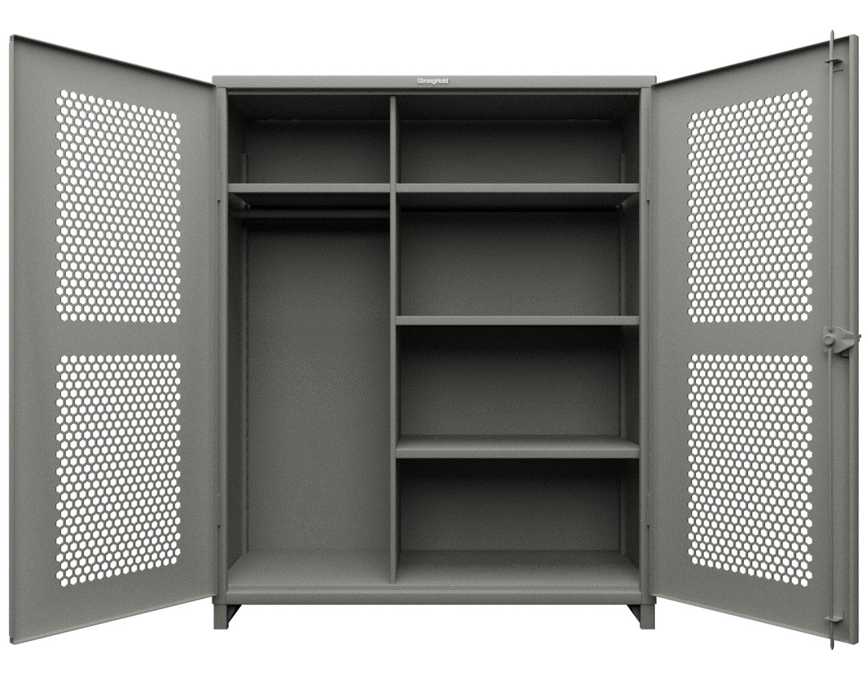 - This Strong Hold cabinet is built to support your toughest industrial storage needs. Made with 12 GA steel, the cabinet stands at 78 in. H x 60 in. W x 24 In. D. The ventilated (hex) doors do not sacrifice any of the structural strength of our all-welded, wrap around body which can now support up to 11,000 lbs. They also allow for visibility as well as airflow while maintaining security. This cabinet features 4 adjustable shelves that have a load capacity of 1950 lbs each.