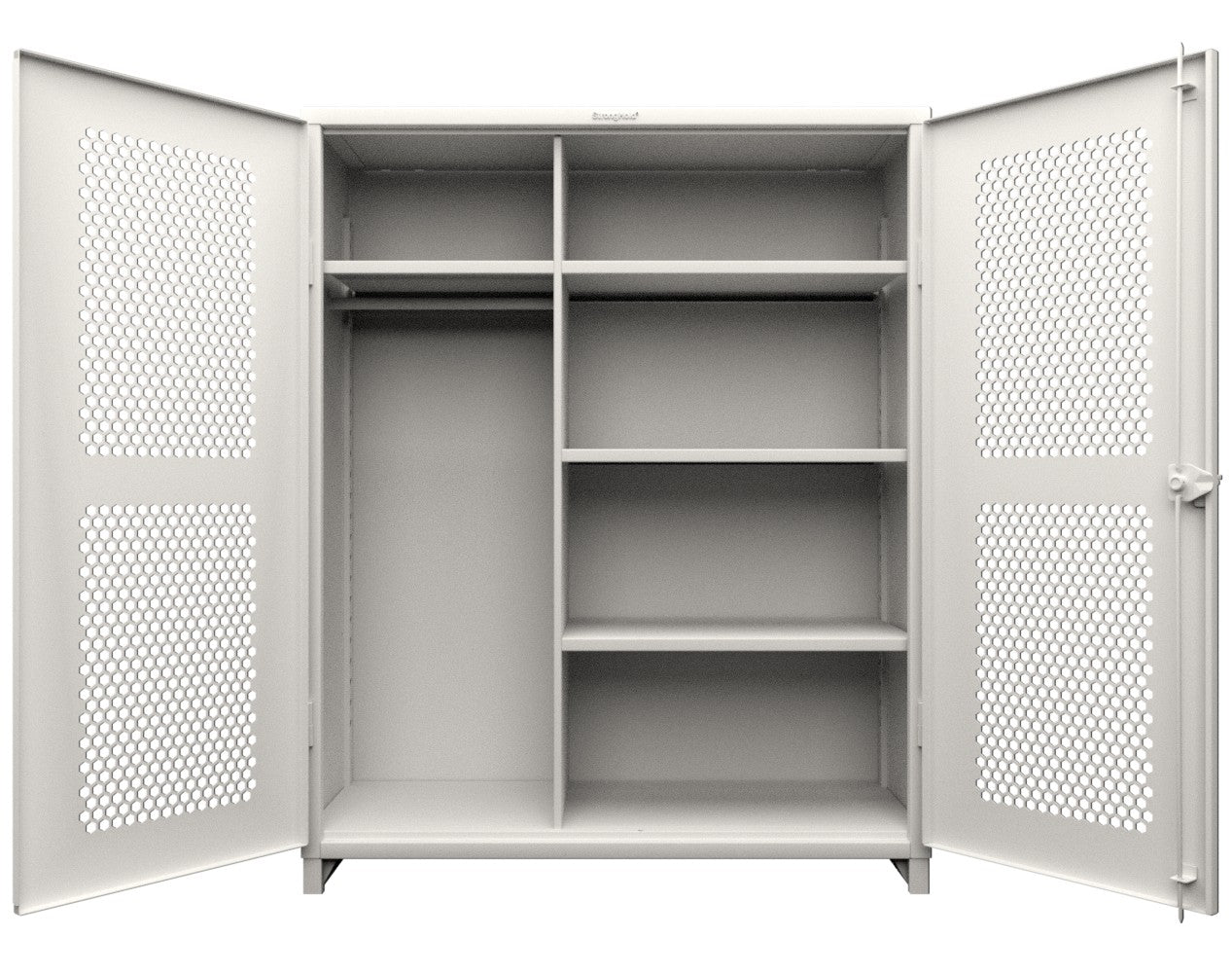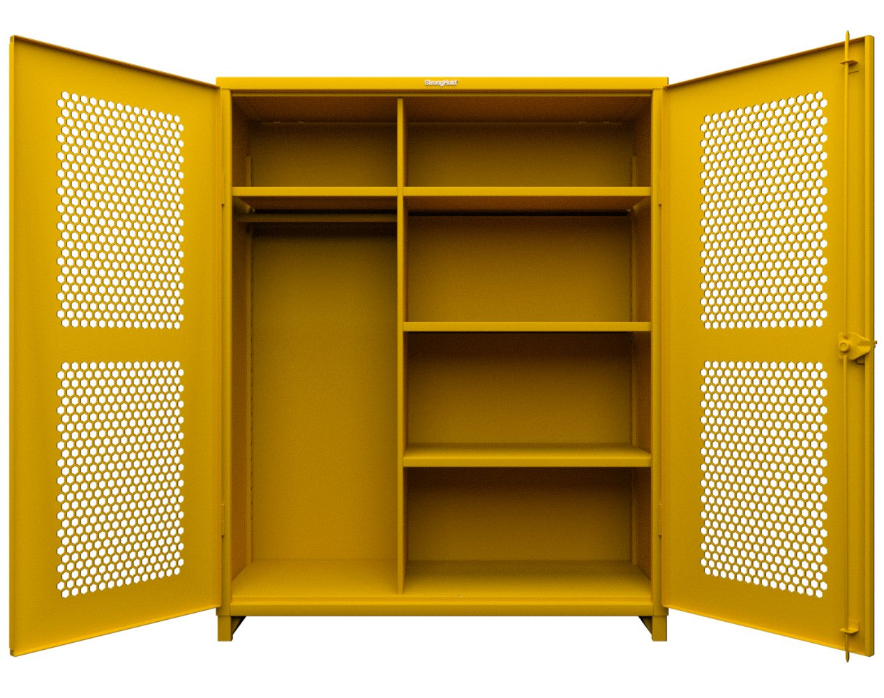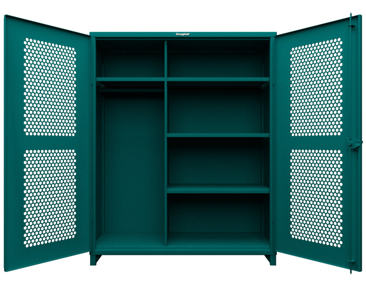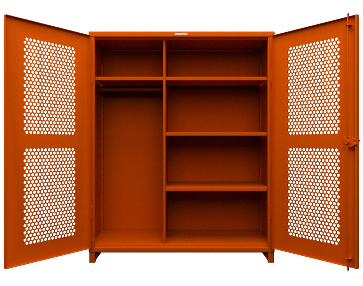 - This Strong Hold cabinet is built to support your toughest industrial storage needs. Made with 12 GA steel, the cabinet stands at 78 in. H x 60 in. W x 24 In. D. The ventilated (hex) doors do not sacrifice any of the structural strength of our all-welded, wrap around body which can now support up to 11,000 lbs. They also allow for visibility as well as airflow while maintaining security. This cabinet features 4 adjustable shelves that have a load capacity of 1950 lbs each.
