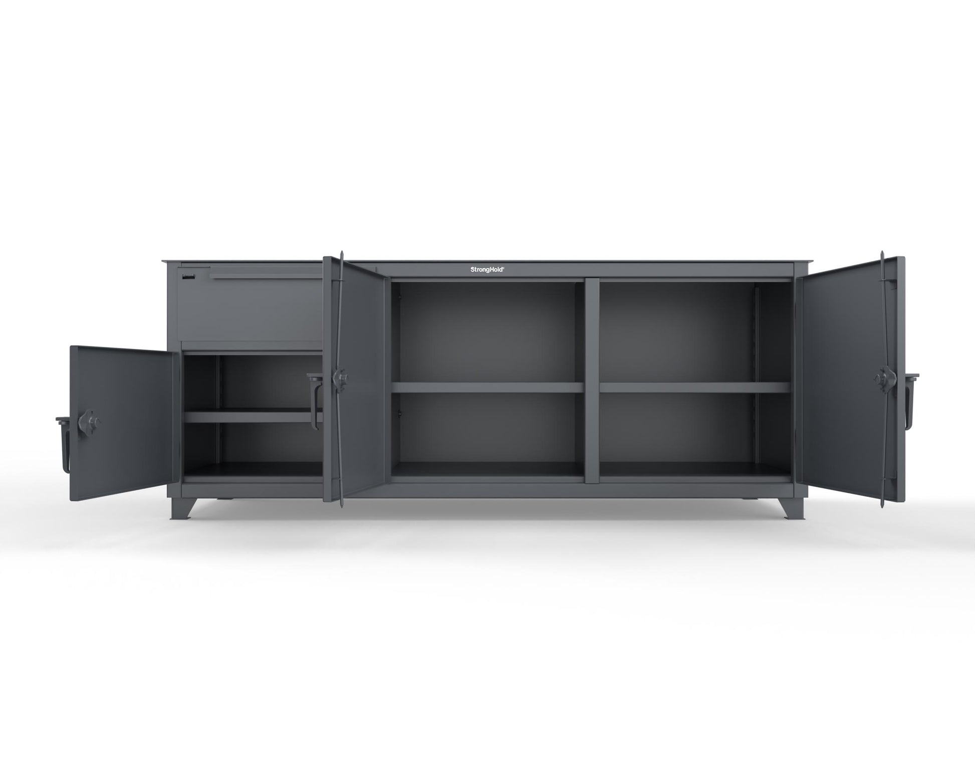 - Strong Hold's Extreme Duty workbench ensures a strong and dependable workstation. The 12 GA steel body and 7 GA steel tabletop are able to support extreme weight loads, suitable for most industrial plants. Includes 1 drawer with a capacity of 400 lbs per drawer. There is also 3 high-capacity shelves with a shelf capacity of 1000 lbs. per shelf. Shipped fully assembled, this table is immediately ready for use. We are a Veteran Owned Small Business, proudly manufacturing our products in the USA. The quality and durability of Strong Hold products is unmatched and backed by a 99-year warranty.