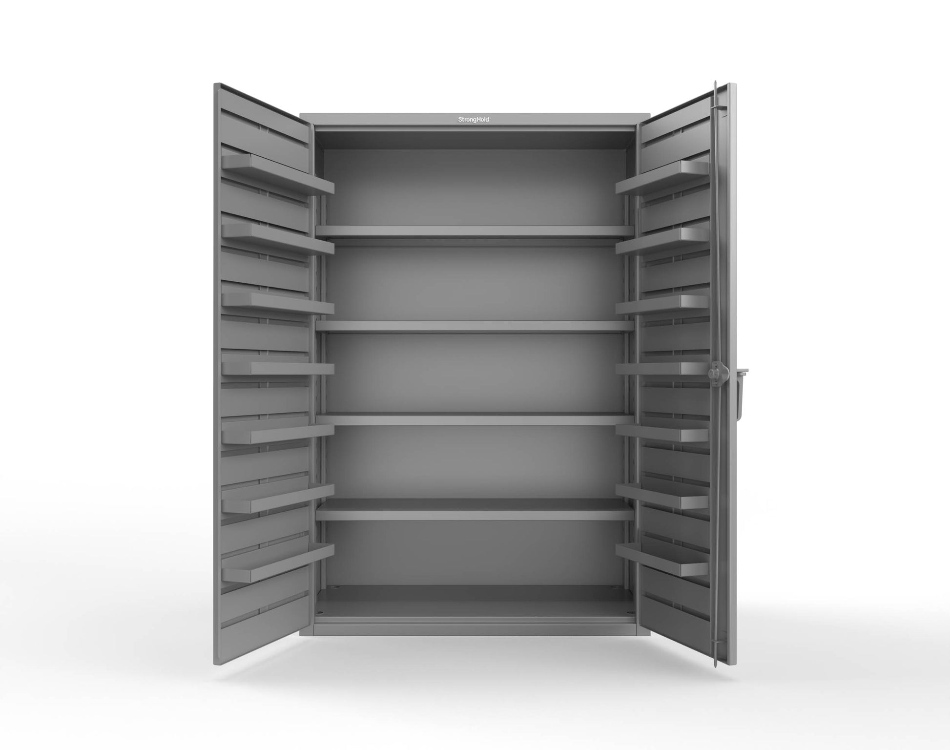 - This Strong Hold cabinet is built to support your industrial storage needs. Made with 14 GA steel, it stands at 72 in. H x 48 in. W x 24 In. D. The cabinet features 14 steel door pans. In addition, the cabinet also has 4 shelves that have a weight capacity of 1200 lbs each. Small to medium-sized items can be stored in the pans, while your large parts and tools will easily fit on the shelves, making it a versatile storage solution.