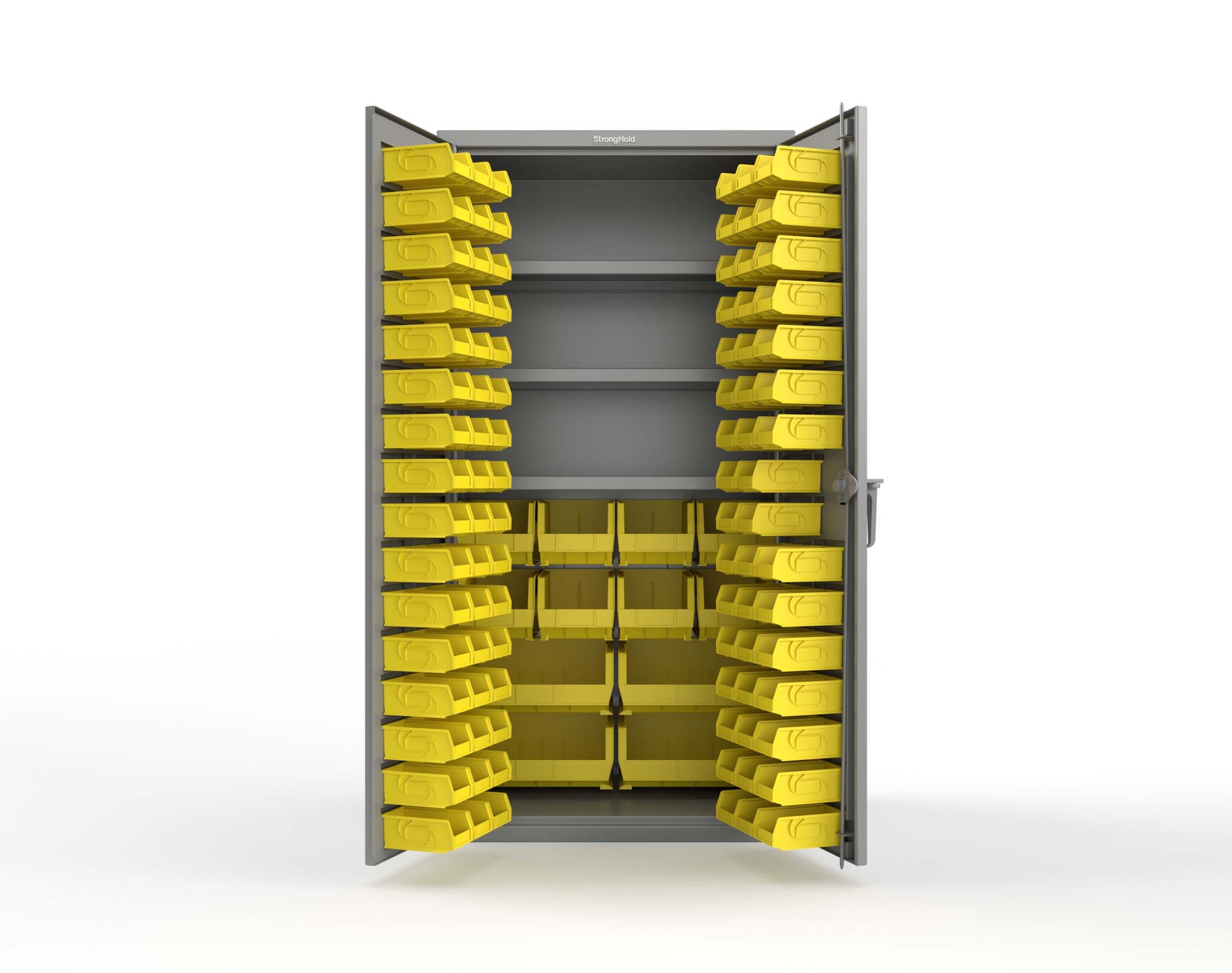 - This Strong Hold cabinet is built to support your industrial storage needs. Made with 14 GA steel, it stands at 75 in. H x 36 in. W x 24 In. D. The cabinet features 106 polypropylene bins. In addition, the cabinet also has 3 shelves that have a weight capacity of 1900 lbs each. Smaller items can be stored in the bins, while your large parts and tools will easily fit on the shelves, making it a versatile storage solution.
