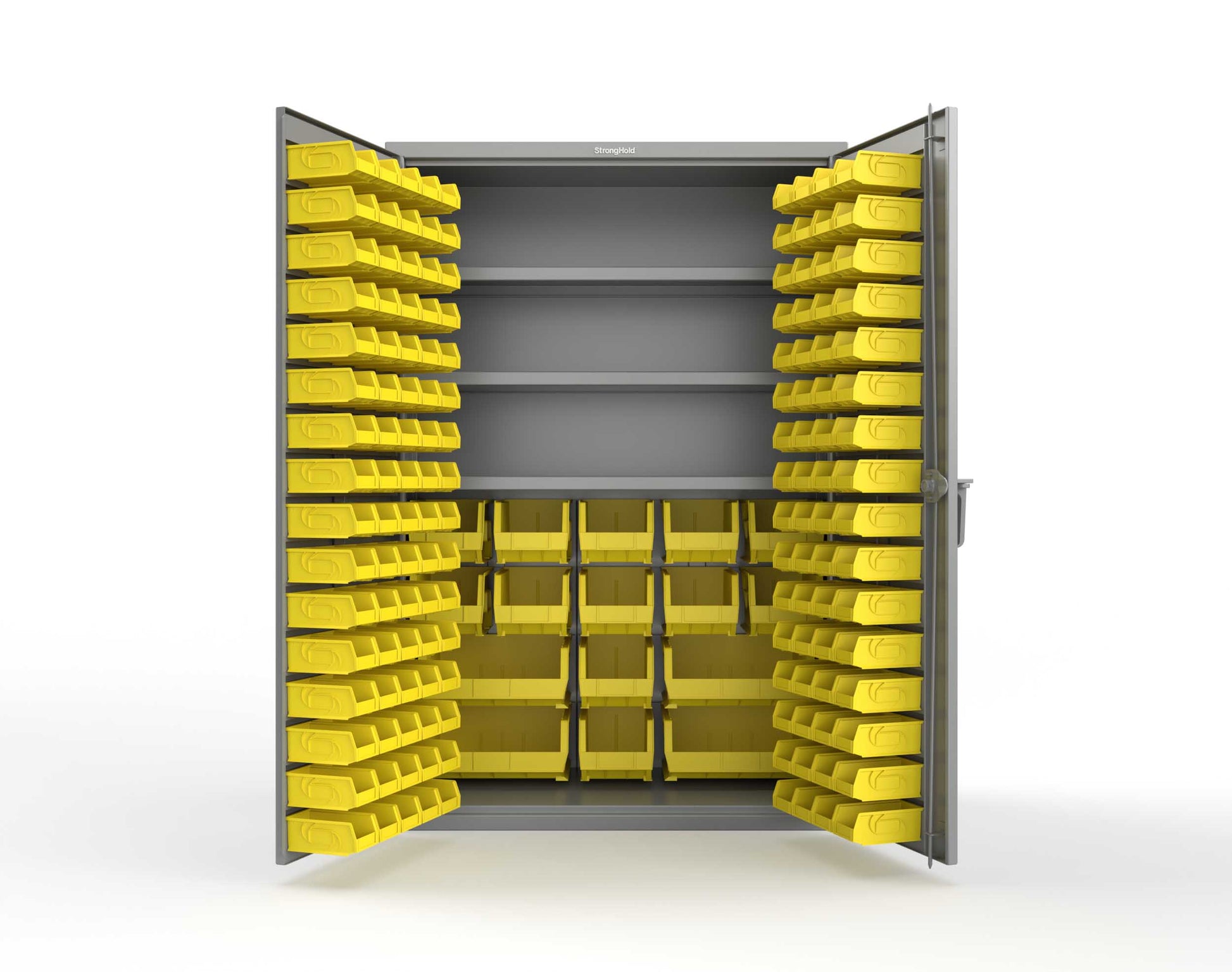 - This Strong Hold cabinet is built to support your industrial storage needs. Made with 14 GA steel, it stands at 72 in. H x 48 in. W x 24 In. D. The cabinet features 160 polypropylene bins. In addition, the cabinet also has 3 shelves that have a weight capacity of 1200 lbs each. Smaller items can be stored in the bins, while your large parts and tools will easily fit on the shelves, making it a versatile storage solution.